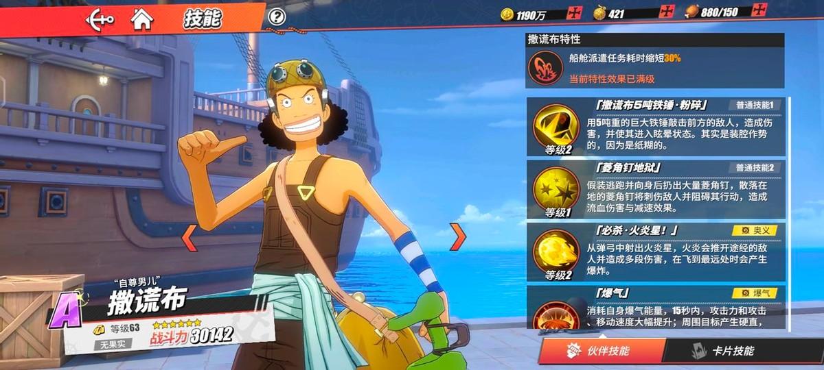 相比爱比达,撒谎布技能多,但难度也不会很大,这里建议直接2技能起手,然后尽量贴脸A,会降低AI释放路飞友情技的概率。然后利用电圈压起身,2技能收尾,留追加技2神之制栽(落雷)。
