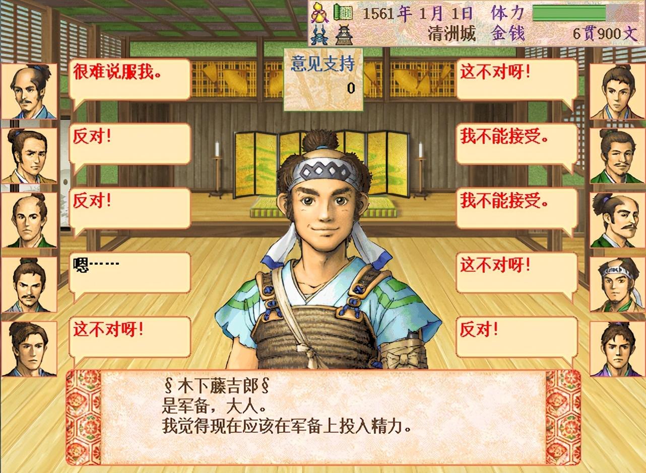 如同上图,刚升为步兵队长、人望较低的木下藤吉郎,此时说话没人听。留意右下角倒数第二的是前田利家,开始也是柴田派,居然也是反对藤吉郎的,这就是派系的力量。