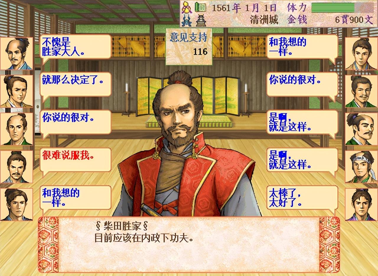 相对而言,柴田胜家作为家中首席家老,那说话就是杠杠的,一片蓝色附和,仅有偶尔一两个其它派别反对。这个就是开始的形势,也非常符合现实情况。