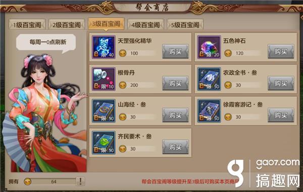 帮会商店也是帮会福利玩法中一个重点福利。玩家每天参与帮会任务,帮会活动会获得一定的帮贡,帮会通宝,帮会资金。其中帮会通宝,可以在帮会商店中兑换各种珍稀的道具。其中采集技能提升等级的秘籍就只有帮会商店中可以兑换。此外还包含各种等级的装备强化精华。洗炼丹,根骨丹,藏宝图,五色神石,暗器修炼石,继承丹等珍贵的道具。都是游戏中使用量非常多的道具。这些道具都是每周限量购买哦。