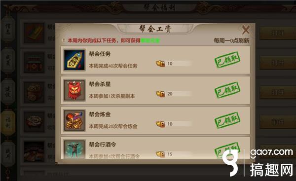 帮会工资,是根据玩家,每周完成的指定帮会活动后,可以领取的绑定元宝。绑定元宝在游戏中是非常重要的货币,可以在绑元商城中购买到,比如宝石,时装等道具。每周完成素有的帮会工资任务后,基本上可以获得100多的绑定元宝哦。而且参与这些任务活动,还会有很多其他的活动奖励哦。