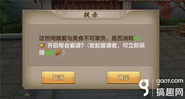 帮会宴请活动,是增加帮贡的最好活动,每位帮众,每天可以发起一次帮会宴请,需要消耗50元宝,可以获得400的帮贡。发起宴请后,会在帮会驻地刷新出很多的宴席,其他帮众收取美食后,可以获得酬谢牌,使用后可以获得帮贡奖励。帮贡在游戏中,主要是用于提升帮会修炼等级,如果帮贡不够用的话,别往了帮会宴请活动哦。