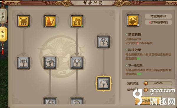 每个帮会的帮会研究只有帮主和副帮主可以消耗帮会资金进行研究。帮会研究可以提升帮会的实力,给所有的帮众带来福利。帮会研究分为生产和军事两个方向。生产方面,就增加帮众生产方面的福利。比如帮会修炼消耗的帮贡减少,参加各种帮会任务,帮会活动获得的奖励提高等。军事方面,主要是一些帮会战斗活动的福利提升。比如帮会宣战消耗的宣战点降低,领地战中的夺旗时间减少等。