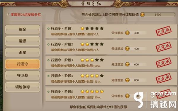 管理分红玩法,是天龙八部手游新版本中新出的玩法。帮会长老及以上职位的玩家可以获得一定的帮会分红,分红的是奖励大量的帮会通宝。具体奖励的数量是根据,炼金,运镖,杀星,行酒令,守卫战,领地战等,这些活动的完成情况来定。完成的活动越多,获得的奖励也就越多哦。