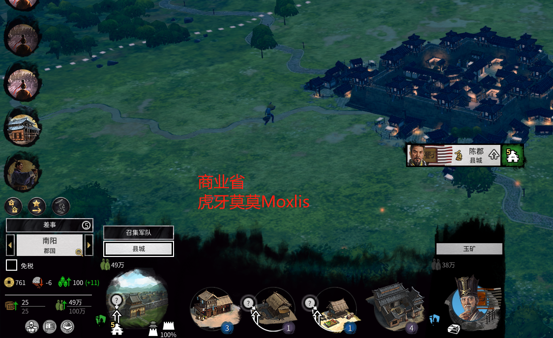 因为5级城只需6粮食,却提供了4个建筑栏位,刚好满足了我的需求。什么需求呢?即要省时间,又要高收益。省时间指的是现实中的时间,不会花费过多的时间和精力去放在内政上点点点;高收益指的是,4个建筑栏位,可以完全将所需配合修建的4个建筑物全部建设出来,而且由于5级城人口上限不高,不会出现治安问题,省了一个治安空位(孔庙)。