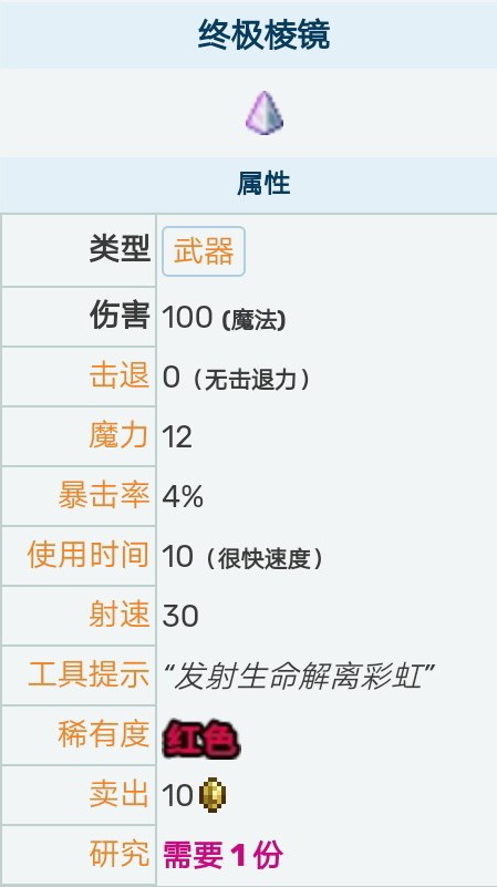 3、由于棱镜只能朝向单一方向进行攻击,在玩家使用时无法抵御来自背后的攻击。在游戏中如果敌人很多则不推荐使用此装备。