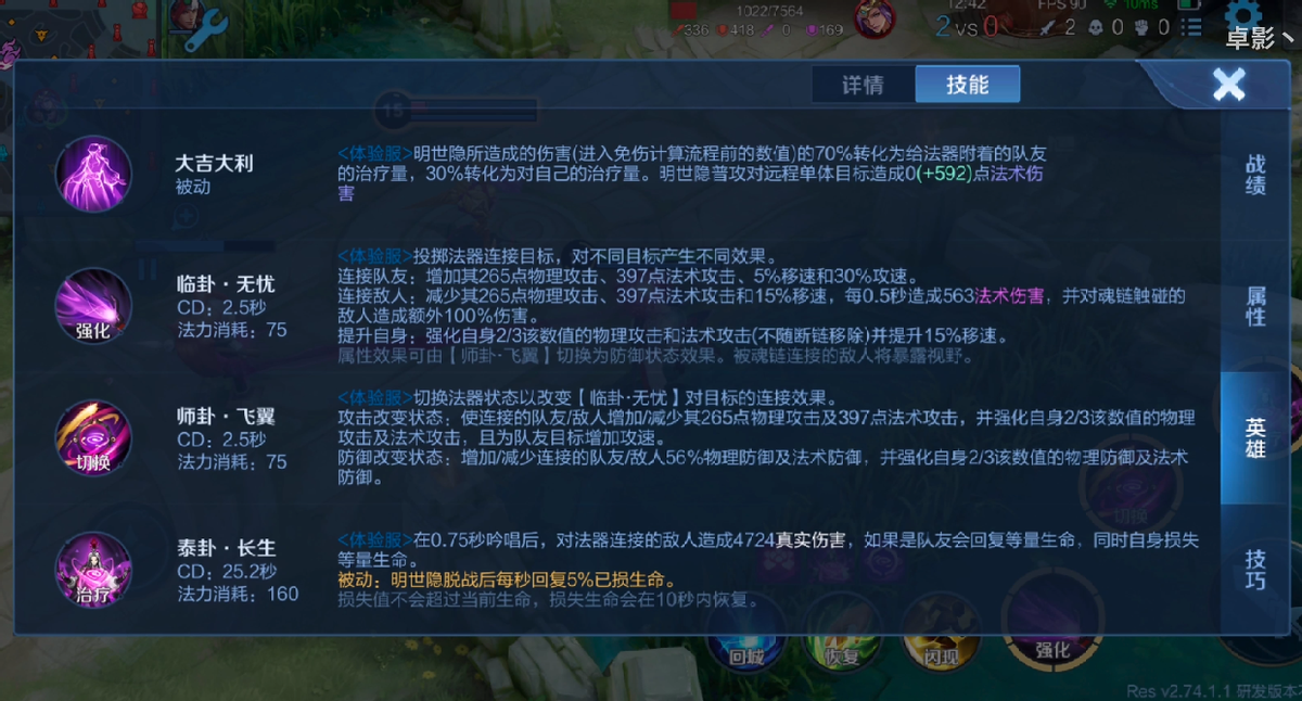 体验服中,明世隐的改动主要在被动和普攻形态,由于英雄变成了远程平A,因此3A眩晕对手的设定移除,转而变成了:每隔5秒,明世隐的真伤强普给自身和队友回血(体验服文案描述错误)。说实话原先眩晕对手的效果本身就很不合理,前期入侵能力是很强,但4级摸不到对手强度就直线下滑了,改为真伤强度会更实用一些,并且这个强普很有说法。
