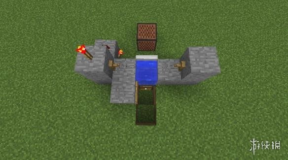 第四步:按图中所示放置红石装置。两个绊线钩之间放一根线;铁活板门放置方法如下图,保证是靠着漏斗且是立起来的状态;放告示牌是为了阻挡水流。