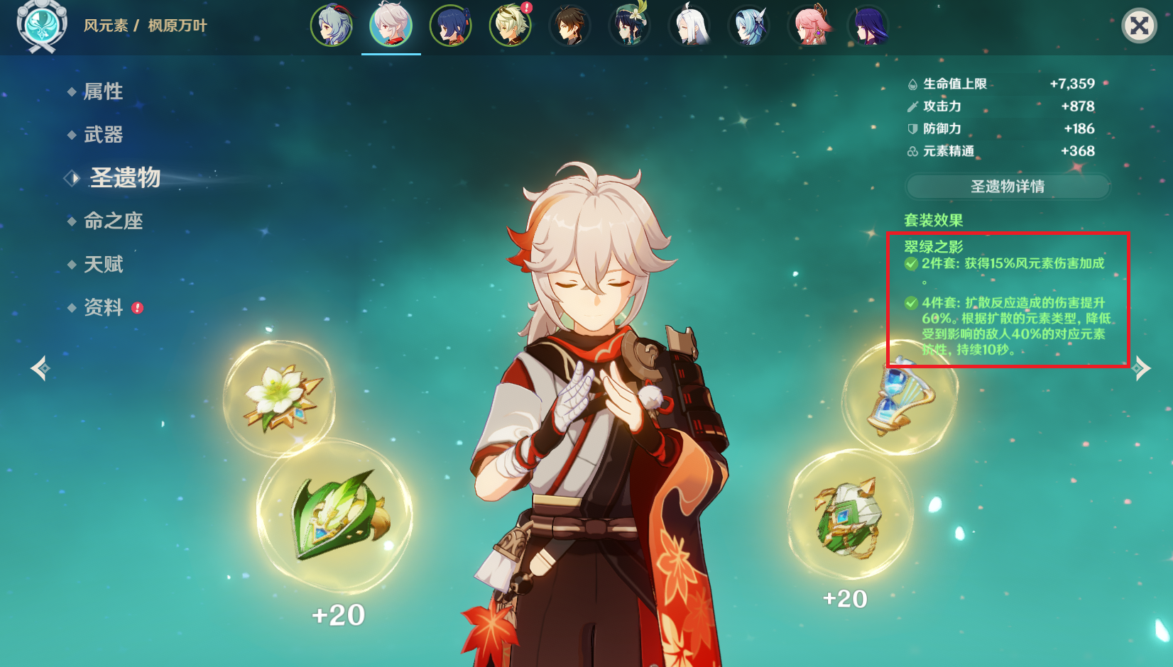 众所周知,由于枫原万叶是风元素辅助定位角色,所以他的5星圣遗物最终只有一个选择,那就是翠绿之影4件套(游戏前期的小伙伴,可以选择4星教官套和5星乐团套过渡)。