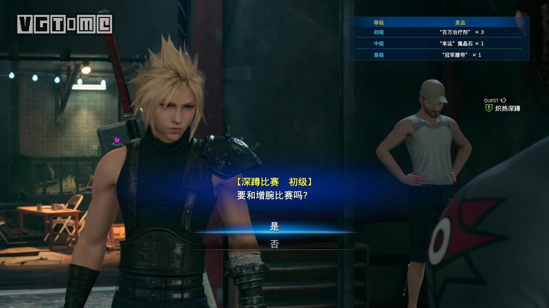 完成 13 和 14 号支线任务之后,回到指压店会遇到斗技场的 NPC,对话之后前往斗技场选择挑战特别赛,完成战斗即可。特别赛的对手是一个神罗的机器人,带上雷属性的魔法会更容易一些。