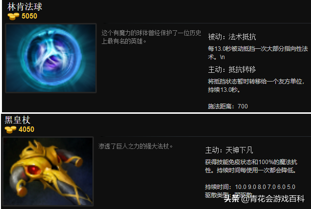 魔法抗性和护甲类似,能让你按百分比减少受到的法术伤害。DOTA2中的魔抗装备其实数量非常有限,比如挑战头巾、烟斗,并且魔抗装备不一定适合你选用的英雄,所以很多时候C位会选择出“免疫装”来替代魔抗装。比如黑皇杖在开启之后可以在一段时间内免疫法术,林肯法球可以为英雄抵挡一次法术效果,但是要记住,有些技能的效果并不会被免疫,就算伤害被阻挡了但是控制效果依然会产生。