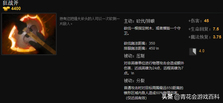 狂战斧是一件不错的装备,但它的定位是打钱发育装,早出狂战的更大意义是加速你的发育进程而不是让你直接A上去。很多新人常犯的错误就是以为出了狂战斧之后自己的英雄就成型了,然后就开始疯狂参战。另外还有一点比较可惜,狂战斧只对近战英雄生效。