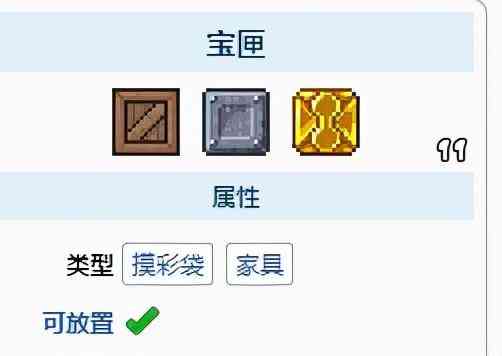 宝箱是钓鱼时有机会钓到的摸彩袋类物品,包含着随机的战利品,比如矿石、锭、药水、配饰和其他物品。此外,生物群落特定的宝匣中还可能包含生物群落特定的战利品。
