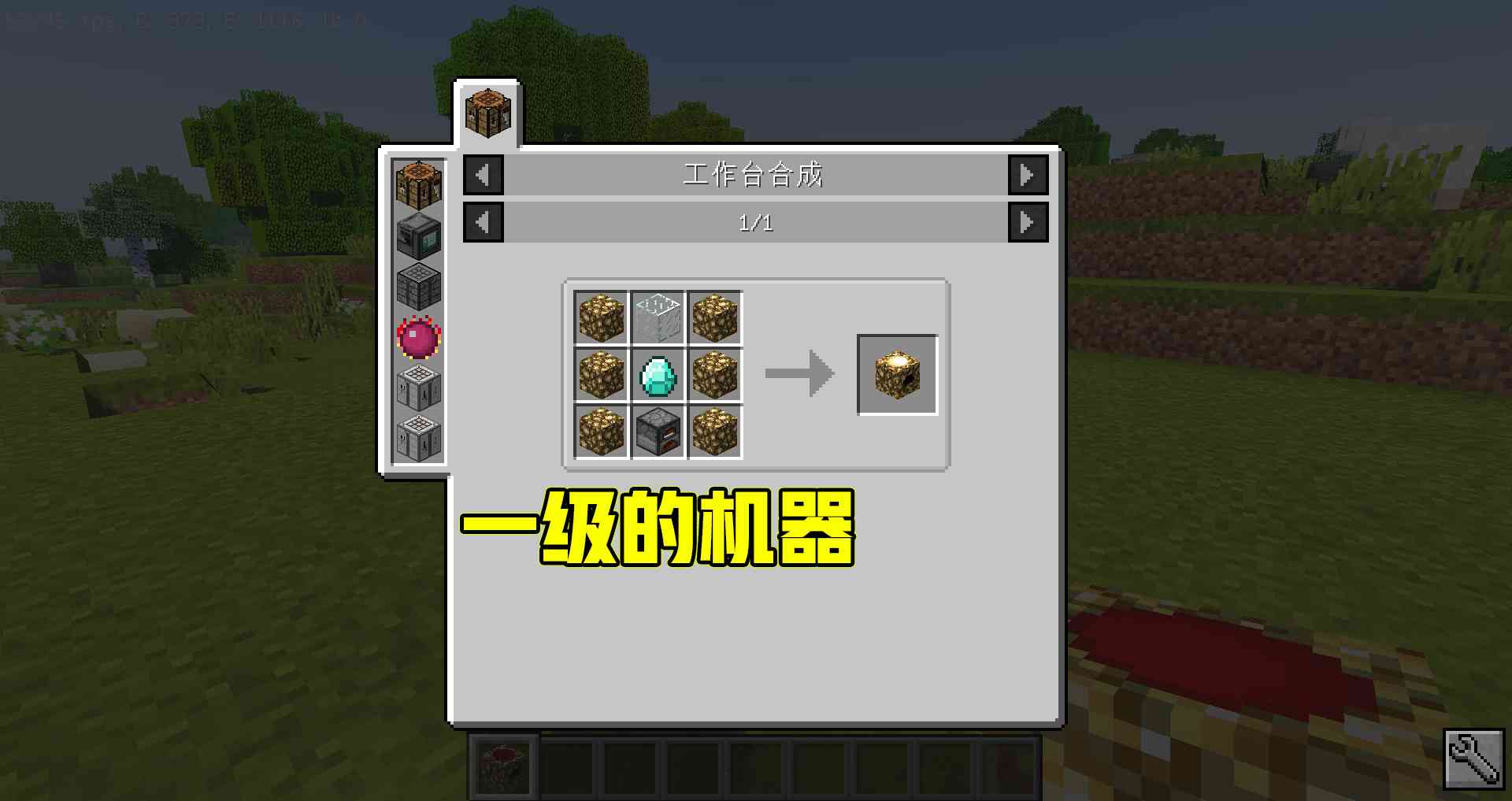 首先看到的是一个简单的合成表,说简单其实也不是很简单的,因为这个物品需要一颗钻石以及几个萤石照明方块,再加上一个熔炉就可以合成一个这个机器了,它是用来收集一些能量的,我们可以理解成从自然界收集一些能量,再与内部的物品进行一个自然融合,最终转化成另外一个物品,转化的物品则是比被转化的物品等级要高。