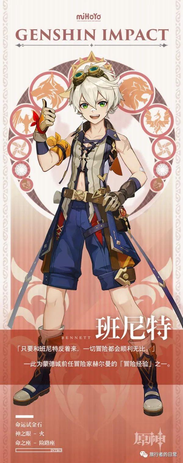 班尼特,定位为火系增伤,回复角色,当前版本回复位最强辅助,也是游戏中极少数四星同定位完全吊打五星的角色。对比已经十分强势的五星增幅角色琴,班尼特在当前绝大部分怪物具备的常规10%抗性面前对琴具备碾压级优势,在20%抗性怪物面前和琴在伯仲之间,抗性更高则琴会逐渐建立优势,班尼特这个角色为玩家抽到必练的角色。