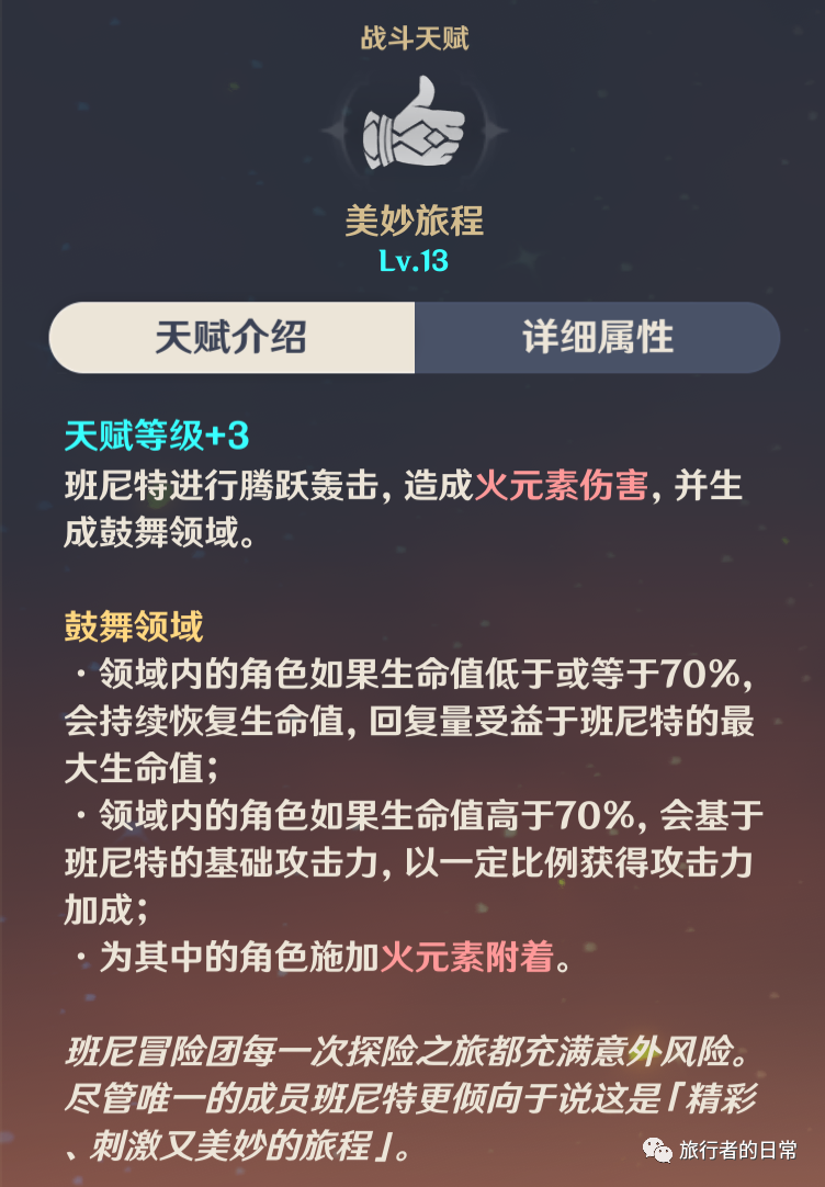 因此班尼特选择武器时要优先选择基础攻击力高,并且尽量副词条是充能的武器,班尼特在200充能的状态下几乎可以实现全场大招覆盖;此技能推荐直接升至满级,皇冠可以毫不犹豫地扔下去。