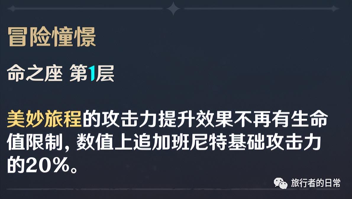 1命:班尼特的元素爆发的攻击力提升效果不再有血量限制,并且数值上额外追加班尼特基础攻击力的20%,也就是说班尼特可以全程对角色输出进行增幅,对班尼特提升巨大,核心命座