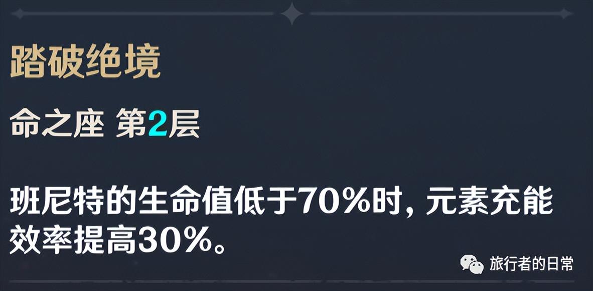 2命:班尼特的生命值低于70%时,元素充能效率提高30%,众所周知,班尼特在血量70%及以上时不会回血,所以除了小部分时候接近70%直接一跳回复超过了70%血量,大部分时候这个30%的充能提升是常驻的,这也是另一个不推荐堆血的原因。