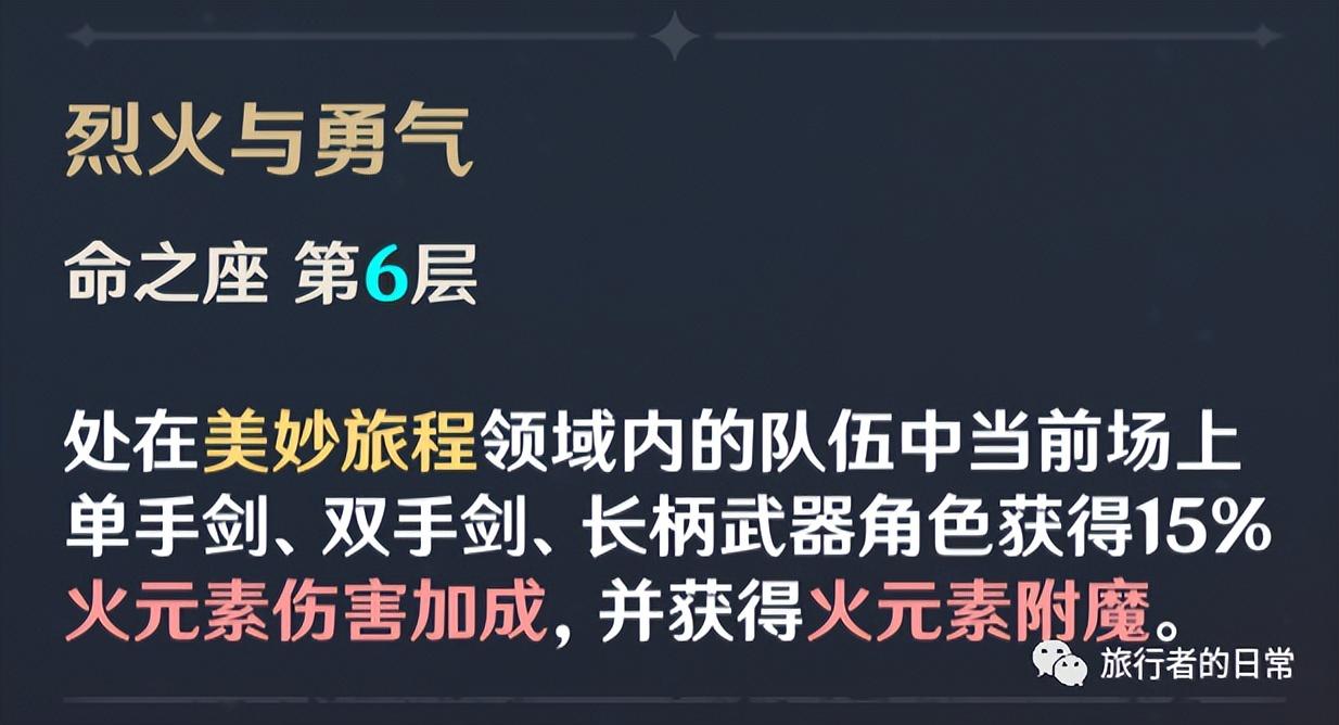 6命:处于班尼特元素爆发生成的领域中,近战角色获得15%的火元素加成,并且获得火元素附魔;虽然技能描述上只有近战武器能够获得15%的火元素加成以及火元素附魔,但是实际上远程武器也能吃得到。因为火元素附魔的关系,很多人不愿意点6命,但是实际上,除了刻晴和优辣以外,其他角色都不会受到影响,并且这个命座对火元素角色提供的增幅和破盾效率的增幅都不错,所以还是推荐点的。