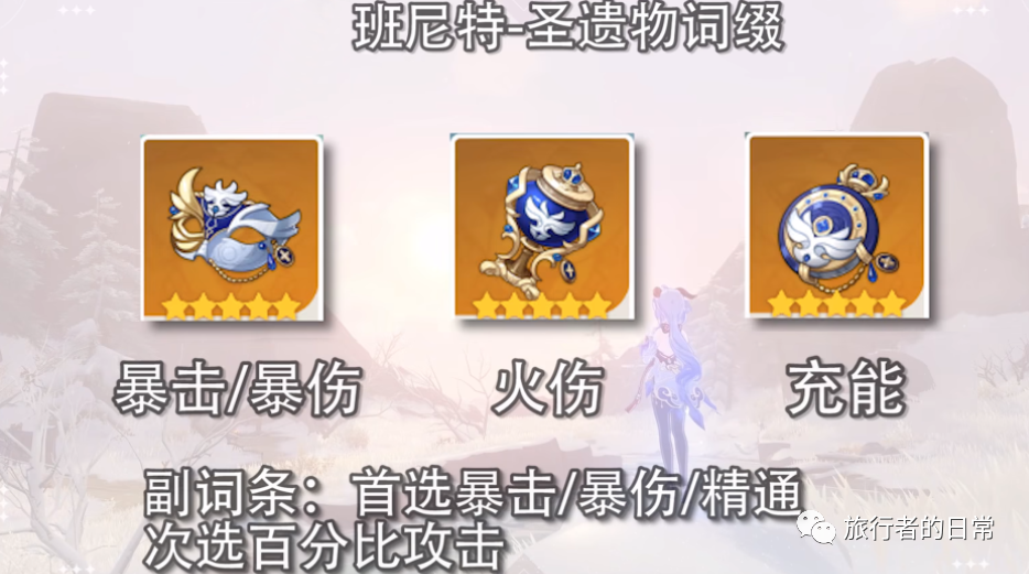 主词条:暴击/爆伤头,充能沙漏,火伤杯子