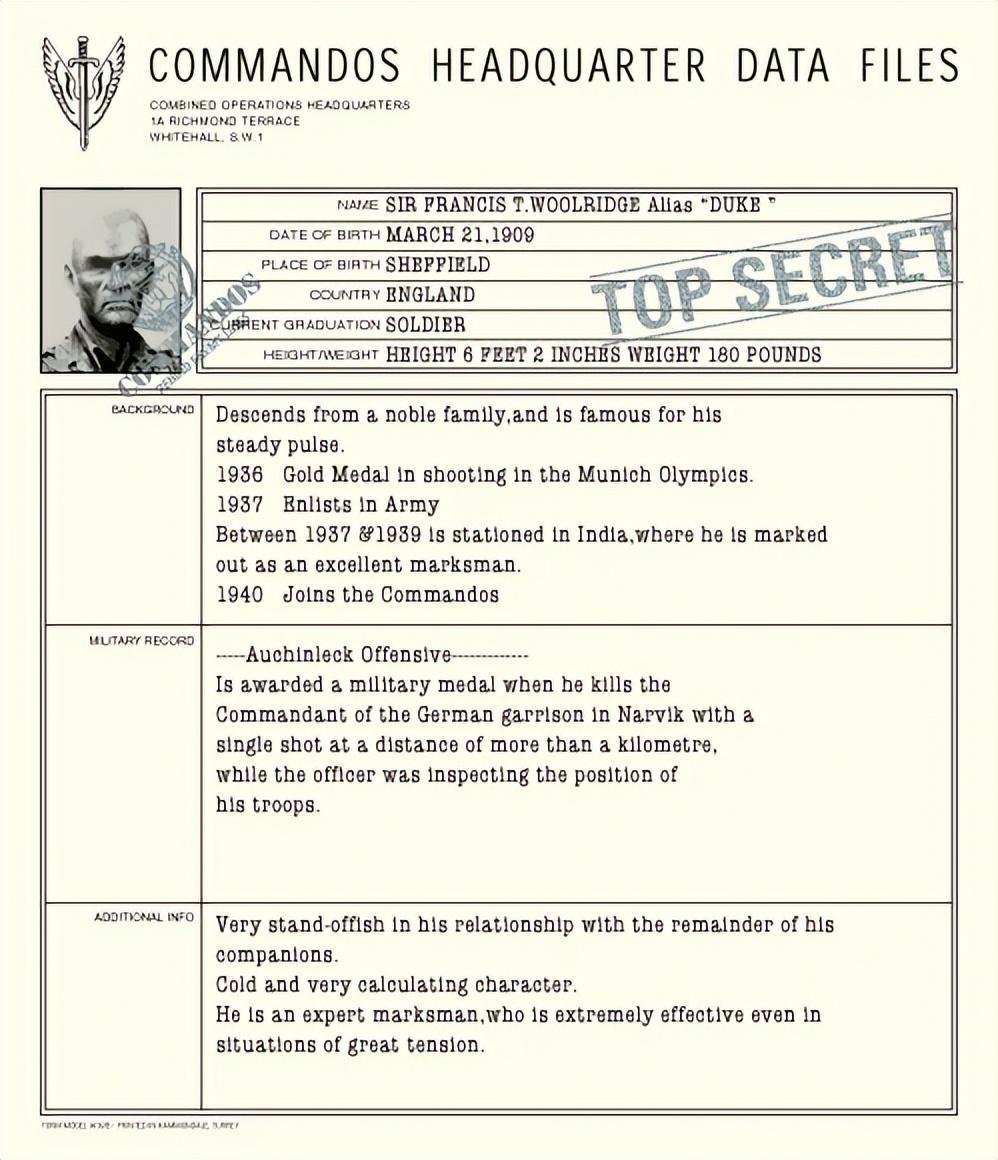 弗朗西斯·T·沃尔里奇爵士于1909年3月21日出生在英国的谢菲尔德,被称为狙击手或公爵。他是贵族家庭的后裔,于1936年在柏林奥运会上获得射击项目的金牌。1937年,他应征入伍;于1937年至1939年间驻扎在印度,被公认为神枪手;1940年加入了盟军敢死队。当他在超过一英里的距离仅一枪杀死了德国在纳尔维克的卫戍部队的指挥官时,他获得了一枚军事奖章。