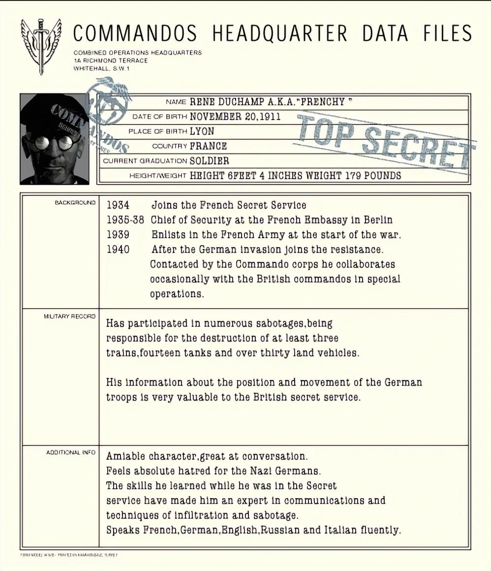 瑞恩·杜尚于1911年11月20日出生在法国里昂,被称为间谍、幽灵或法国佬。他在1934年加入法国特勤局,在1935年至1938年间担任法国驻柏林大使馆的安全负责人。在1940年德国入侵法国后,他加入了抵抗组织。不久后,盟军敢死队招募他为一名兼职队员。此后他经常与敢死队员合作开展特别行动,参与了多次破坏活动,并摧毁了至少三列火车、十四辆坦克和五十多辆车。他关于德国军队的信息对英国特勤局而言至关重要。