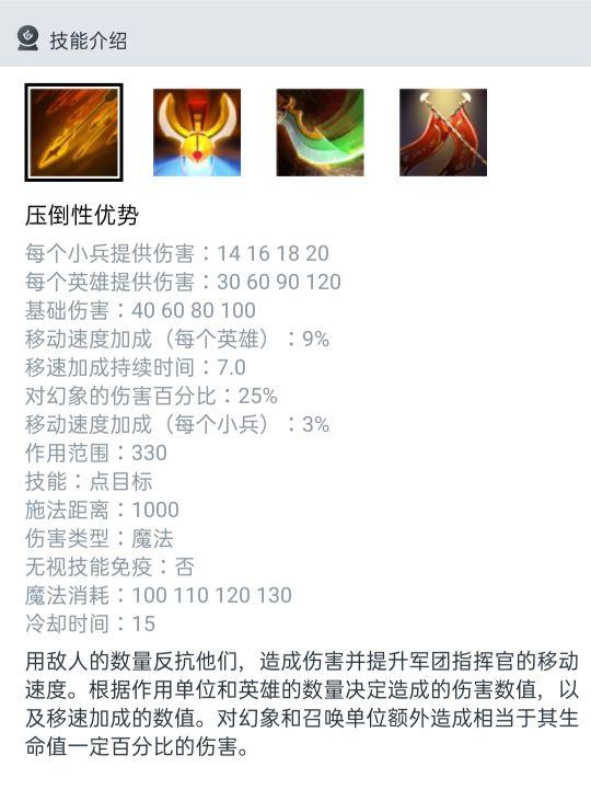 压倒性优势是加强版的aoe技能。敌方单位越多,打出的伤害就越高。对方如果站位不好,几个残血打算报团取暖,那军团就嘿嘿嘿了,一个压倒性优势甩出去,准会有意外收获哦。此技能对幻想系还有一定的克制作用,前期装备没有成型的猴子,小娜迦都不敢再军团面前乱用分身。使用压倒性优势造成伤害后,还能为军团提供百分比的移速,配合军团自身的超高移实现速黏人追杀和逃生。