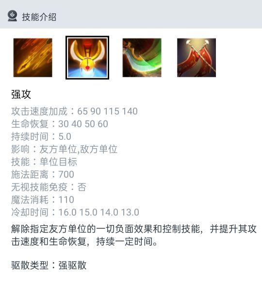 2技能‘强攻’也是一个非常实用的技能。它能解除友方单位的一切负面buff和控制技能!并提升其攻速和生命恢复,持续5秒。有了这个技能,什么赏金标记啊,大鱼点灯啦,直接废掉他们的‘大招’,美滋滋。另外它还能提供不俗的攻速加成。如果后期攻击力加的够高的话,那防御塔就像纸一样,一个强攻就推掉了。