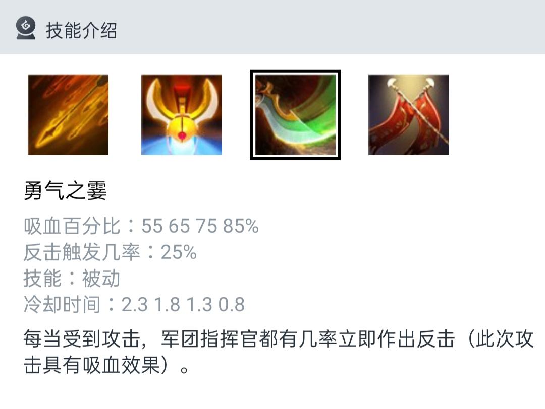 3技能‘勇气之霎’也是神技。它是一个被动技能,每当军团受到普通攻击,她都有几率立刻作出反击,而且这次反击会有吸血效果。1到4级作出反击的几率都是25%,只是吸血会越来越高。当你和对面拼消耗时,最好是敌方小兵越多越好,把敌方小兵的仇恨拉到你身上,这样触发被动的几率就会很高了。欺负一下像敌法师,猴子等没啥控制和爆发的大哥最爽了,看见他们这种没技能的英雄在占线,过去就海扁他,打的凶的军团会把敌方大哥打去钻野。