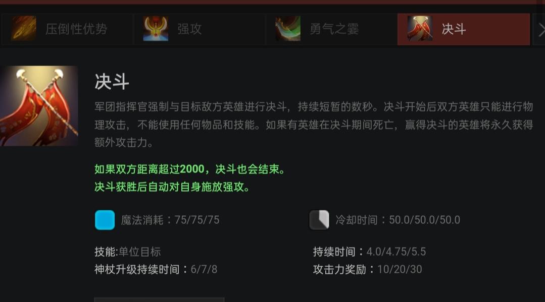 军团强制与一名敌方英雄进行肉搏,决斗开始后双方不能使用任何物品和技能,在此期间如有英雄死亡,那么获胜的一方就会获得永久的额外攻击力。所以到6级之后军团的节奏就相当重要了,游戏进行到15到25分钟是军团的黄金阶段,在这个时间段军团要配合队友一起找节奏,最好把目标定为敌方大哥,扰乱敌方大哥的发育。找不到敌方大哥就杀那些脆皮酱油吧,尽可能的积攒攻击力。军团的决斗也不能无脑使用,团战时如果能和敌方大哥1换1并且能加到攻击力,那就不亏。如果是决斗换掉敌方酱油,加到攻击力还好,没有加到攻击力的话就很亏了。团战时尽量去找对方关键性的英雄和比较难处理的英雄,如蚂蚁,黑鸟,骨法等。军团A杖的效果是提高决斗时间,在决斗时间里,军团是技能免疫的,军团和她的决斗的对手只会受到来自对方的伤害。就是说在此期间军团和决斗的对手都不会受到你俩之外的任何伤害。所以,出A杖是有选择性的,在不用队友辅助的情况下能够击杀敌方英雄可以。还有一种情况是为了控制住敌方关键英雄,如谜团。为了防止谜团大,找到并用决斗控制住他,如果敌方大哥是斯文,为了防止开大的斯文秒掉也可以出。如果你没出A杖想去强控谜团,说不定会被开大的斯文几刀砍死,谜团又能拉大,那就太得不偿失了。