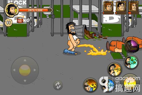 进入剧情后小猫就感受到了设计师的浓浓恶意。有着暴力倾向的流浪汉因为睡在路边被警察发现并被暴打驱逐,于是暴力的汉子奋起反抗,口水(枣核艼)鼻涕(鼻妞妞)一起上,瞬间就淹没了警察叔叔。一路暴走,汉子的各种神技慢慢显现出来,吐槽神功(呕吐),菊花爆(脱裤子放屁),大浪淘沙(掏JJ撒尿)等等。玩到这里小猫已经被这款游戏的设计所折服。这是要把自己的脑洞开的多大,才能设计出这种常人难以忍受的技能。