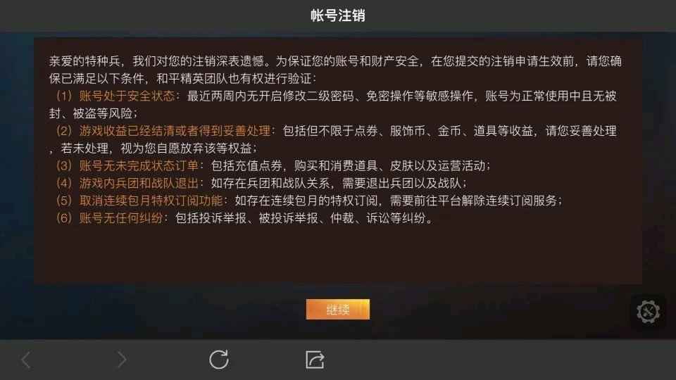 满足这5个条件,就可以点击“继续”并注销账号了,注销之后,这个账号所有的信息、游戏数据、游戏内的资产都会被清空,且不可恢复!