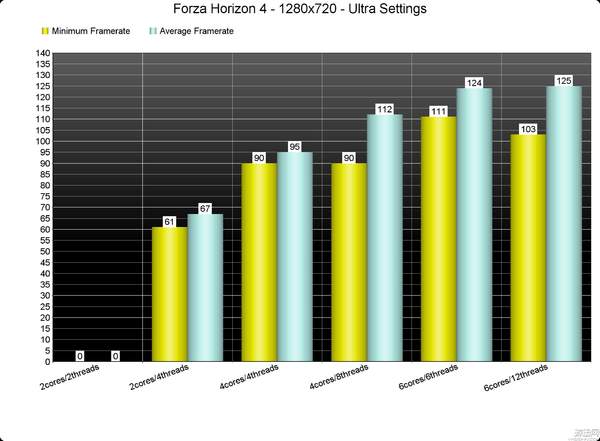 在测试中,为了了解《极限竞速:地平线4》在多种CPU环境下的表现,DSOG模拟了双核和四核环境。令人欣喜的是,甚至在模拟的双核环境下,《极限竞速:地平线4》都可以稳稳地保持60fps的帧数;但需要说明的是,必须要开启超线程,如果超线程是关闭状态的话,游戏根本就不会启动。
