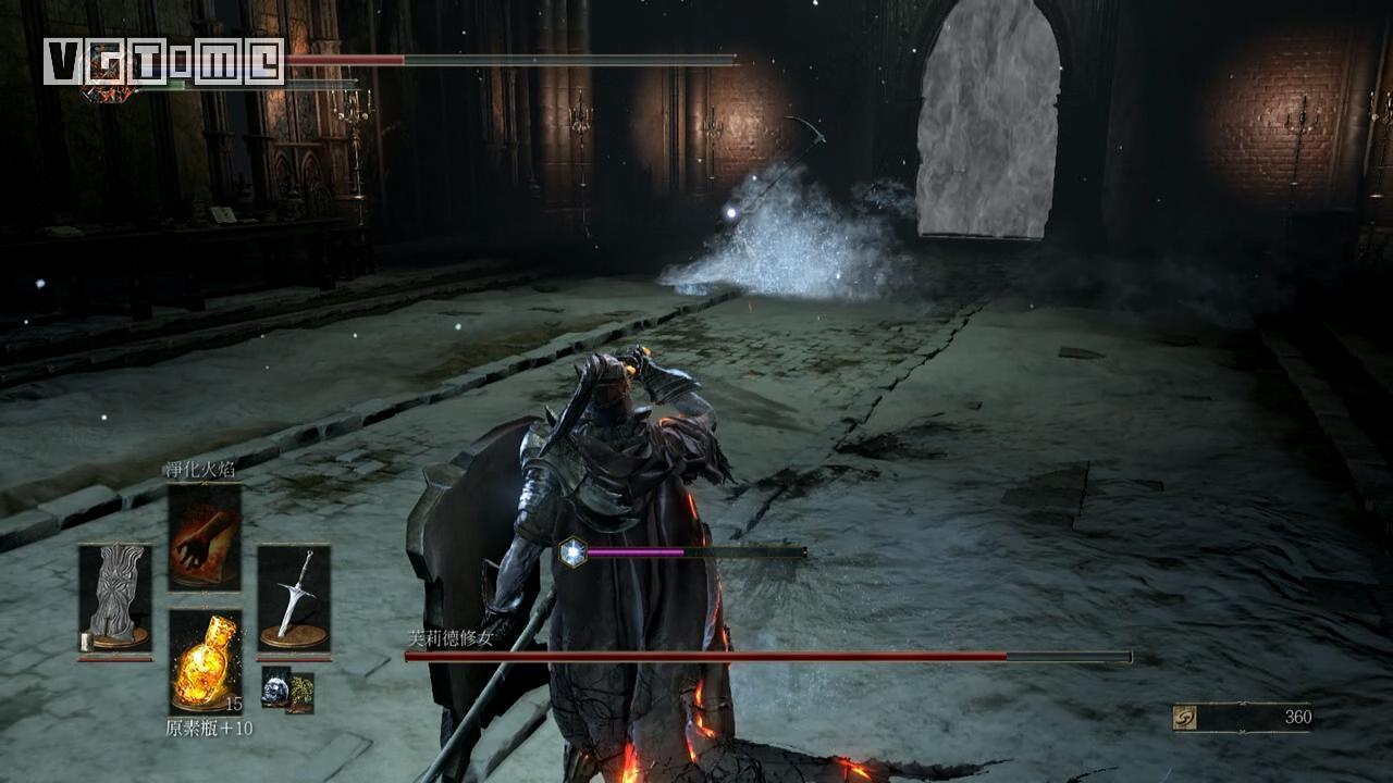 一般我们采取的战术是等待修女出跳跃火焰攻击,躲得位置好可以追击2~3刀。如果躲过了她的割喉,也有几次追刀的机会。如果要在其他时候输出的话,就是顶盾靠近,确认她砍完一套之后追击1~2刀。