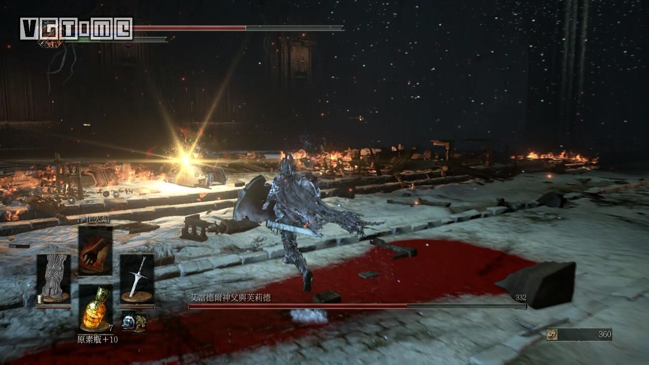 Boss第二阶段,神父也会站起来和修女一起打你。修女的招式与之前差别不大,这个阶段只要注意她的冻伤范围攻击即可,神父的招式比较容易躲,看准时机蹭几下就走。