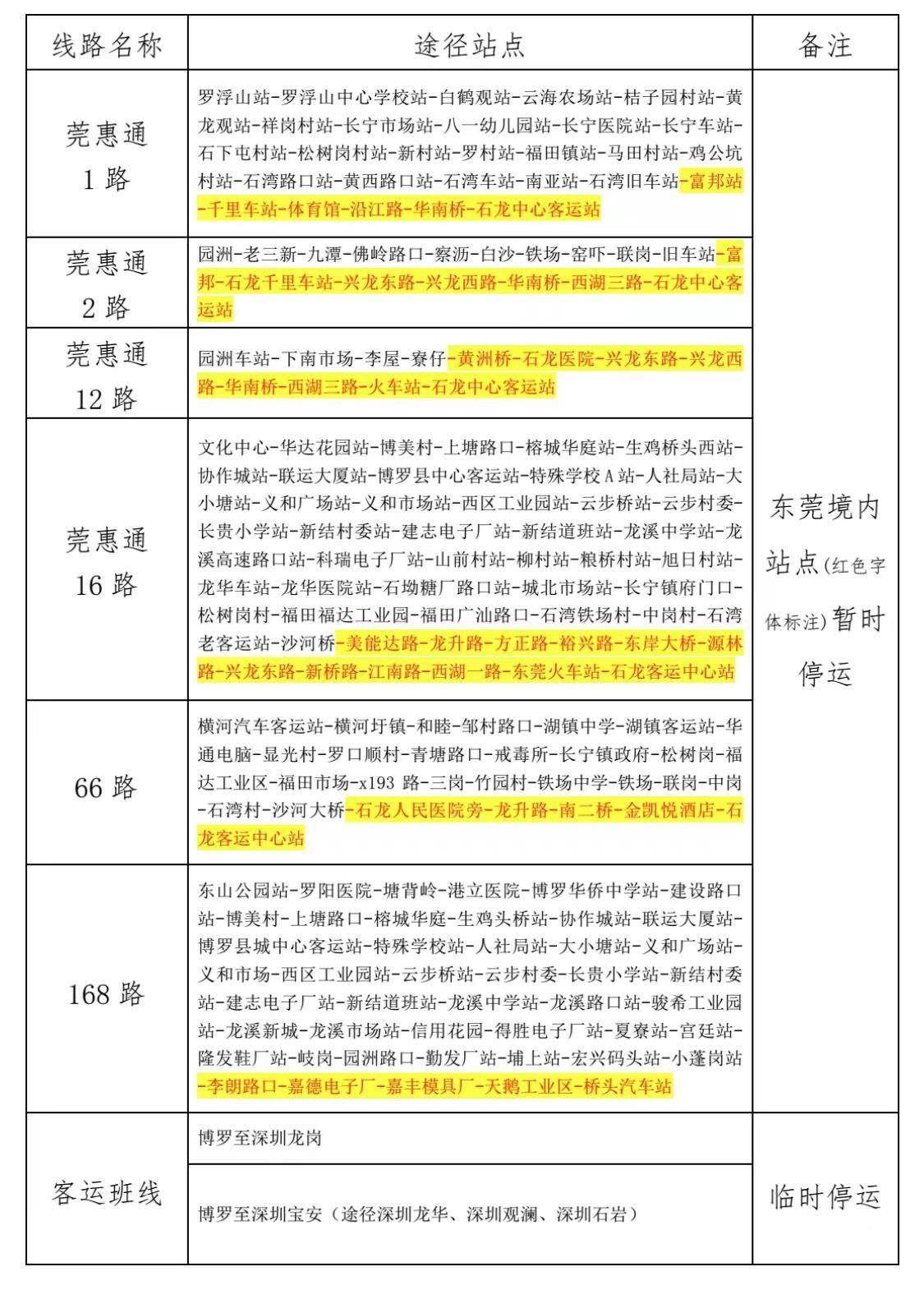 2月1日,博罗县交通运输局发布通告,自2月1日起,停运往返东莞市、深圳市的客运班车、包车及公交线路,恢复时间另行通知。