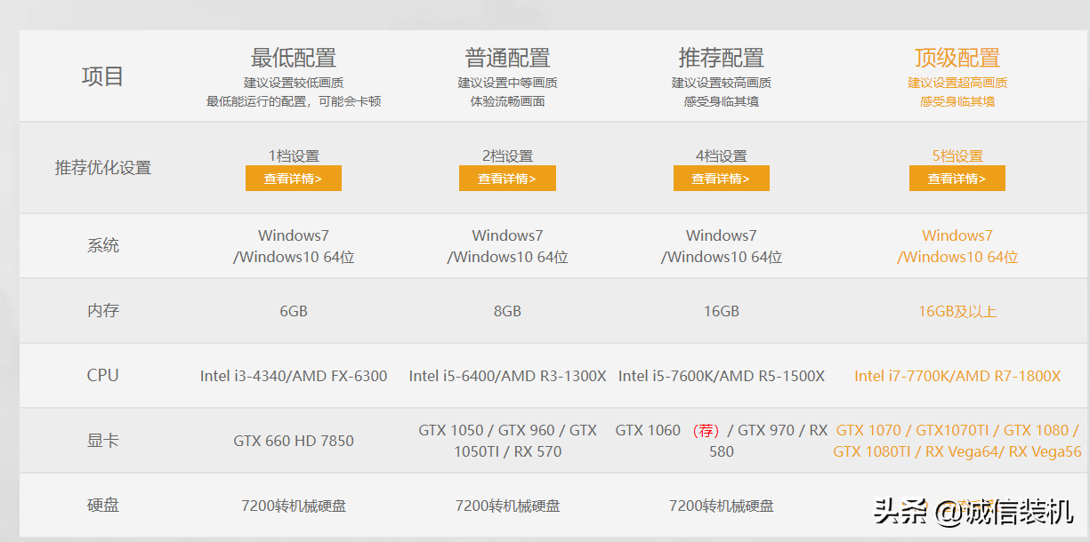 小编是根据官网推荐给大家列举了几款吃鸡电脑配置,建议大家不用考虑第一个电脑配置,毕竟大家玩游戏还是要考虑游戏画面的流畅效果,画面如果卡顿也感受不到娱乐的效果。所以大家尽量考虑后三种配置。其实像这种网络游戏不是很适合电脑配置,毕竟游戏商还要考虑在线人数什么的,要求电脑配置太高谁还去玩。其实只要买到合适的配置,不用买贵的配置,毕竟会造成一些电脑性能浪费。绝地求生根本没必要上I7 I9 3080 3090的,前段时间,RNG战队给选手配的电脑带上显示器也就10000多块,节约其实也是一种美德。大家说我说的对吗,欢迎留言发表自己的观点。