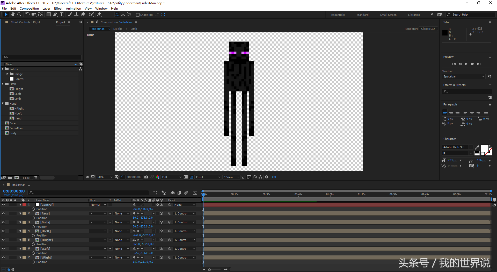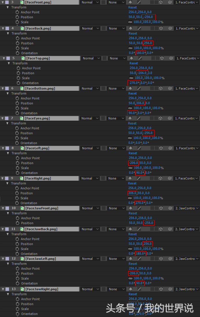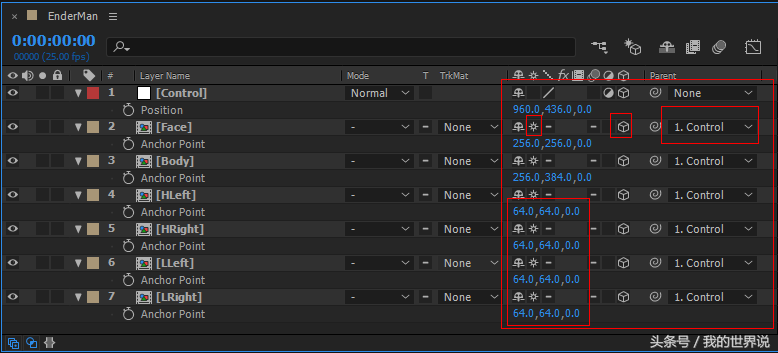 把面部所有的贴图都放到合成里,然后再创建两个空对象,分别控制末影人的下颚和面部整体。