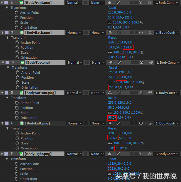 最后新建总合成,把以上6个合成拖进去,激活透显功能和3D图层开关。新建空对象,调整整体缩放和位置。设置四肢中心点,然后组合各个部位。