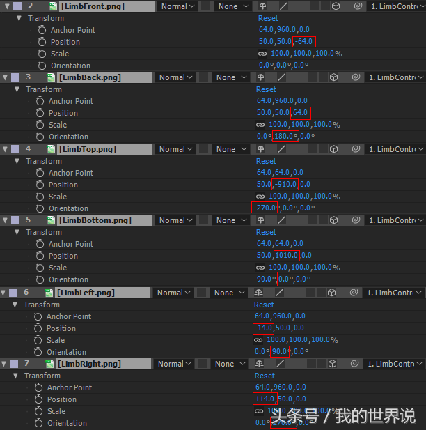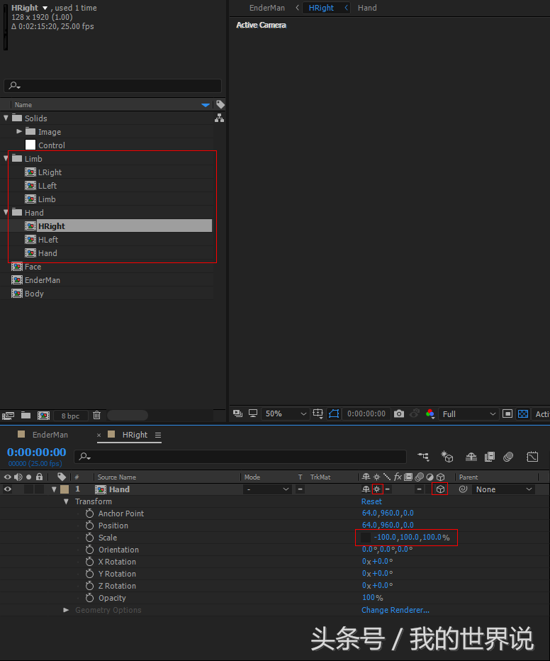 接着复制Limb肢体合成,建立左手右手左脚右脚四个合成。把肢体模型拖进去,激活透显功能和3D图层开关。右手和右脚需要设置Limb合成的X值缩放为-100%。达到水平翻转的效果。