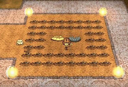 扎一下,对生物造成60点伤害,可以扎十下。众所周知,每隔若干天都会有猎狗追随玩家而来,越到后期越多,而且冰狗火狗都有,万一在野外没有布甲,很是头疼,不过最多十只猎狗。如下图,我们可以造一个狗牙大阵,每当有狗来,就躲过去,多人联机必备阵法!