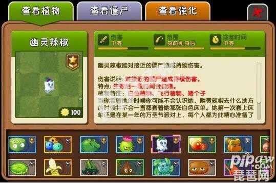 2.【幽灵辣椒】不过高阶的幽灵辣椒会起到更好的效果,攻击距离增加,伤害也提升了,要的就是速度把僵尸解决。其它群伤植物也行,比如带溅射性伤害的【辣椒投手】、带穿透性伤害的【仙人掌】等等....