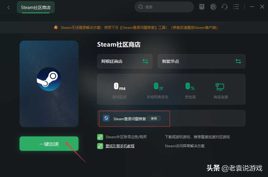 选完区服之后点击【一键加速】。最近有玩家在登录steam时遇到一些问题,都可以使用【steam登录问题修复】按钮进行修复,非常方便好用。