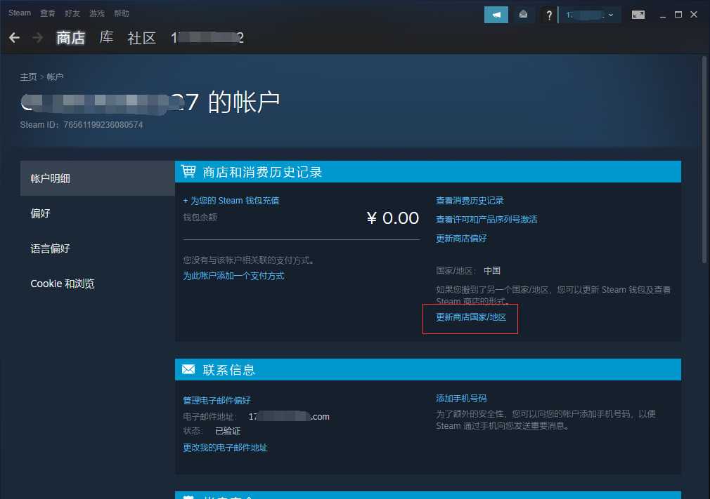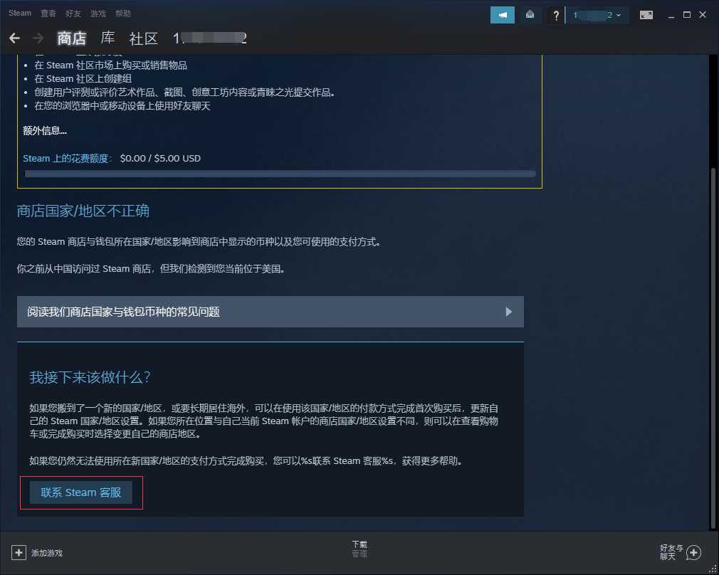点击更新商店国家与钱包币种的下方【联系steam客服】。