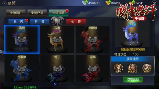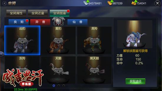 公元1219-1225年成吉思汗亲率二十万大军征服了西域强国(花剌子模)。据记载平均每个将士均需交替轮换驾驭3匹蒙古战马才可完成这场空前绝后的战役!《成吉思汗手机版》中也可收集很多坐骑,角色等级达到55级后开放坐骑图鉴功能。不直接出战的坐骑可放入图鉴,图鉴中的坐骑也可以升级,将为角色提升相应属性,所以要多多收集和你角色属性匹配的坐骑放入图鉴也能提升战力。当然,有条件可以考虑全部收集。