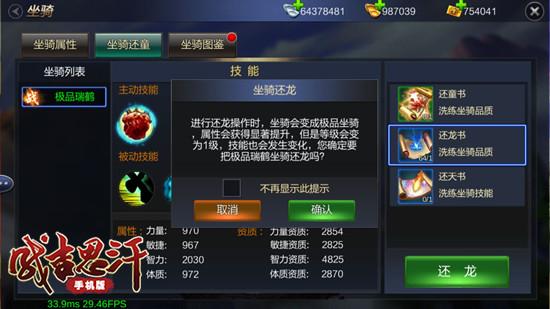 角色到达一定等级并完成引导任务后,可使用还童道具改变坐骑等级、资质、属性、技能。不同还童道具对应的效果不同:还童书:随机改变坐骑品质,且使坐骑等级变为1级;还龙书:将坐骑品质提升至“极品”,且使坐骑等级变为1级;还天书:使坐骑随机改变技能,且等级不变。本次版本中还天书还未开放获取途径,其他道具均通过副本天狼秘境获取。