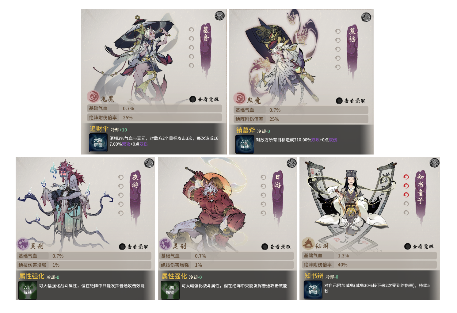 三界上古仙灵们种族各异,仙·羽族、鬼·魔族、妖·巫族、灵·刹族、人族,五大种族无不有着各自擅长的神通,仙族善御,鬼族善攻,妖族善变,灵族善辅,人族自有七窍玲珑心,化大道三千,结合自己结识的仙灵们的特点,适当搭配,便可发挥战阵最大的威力。