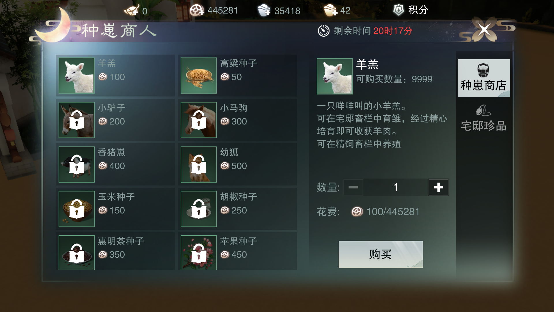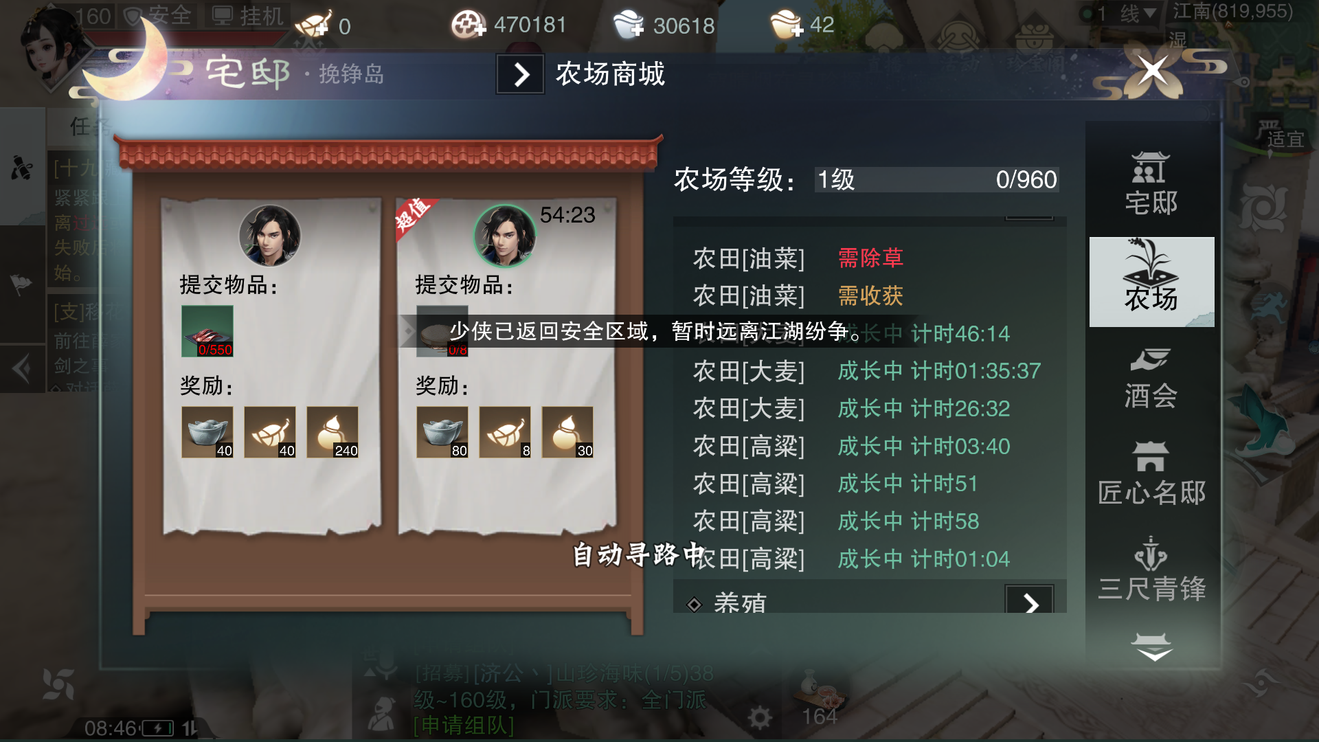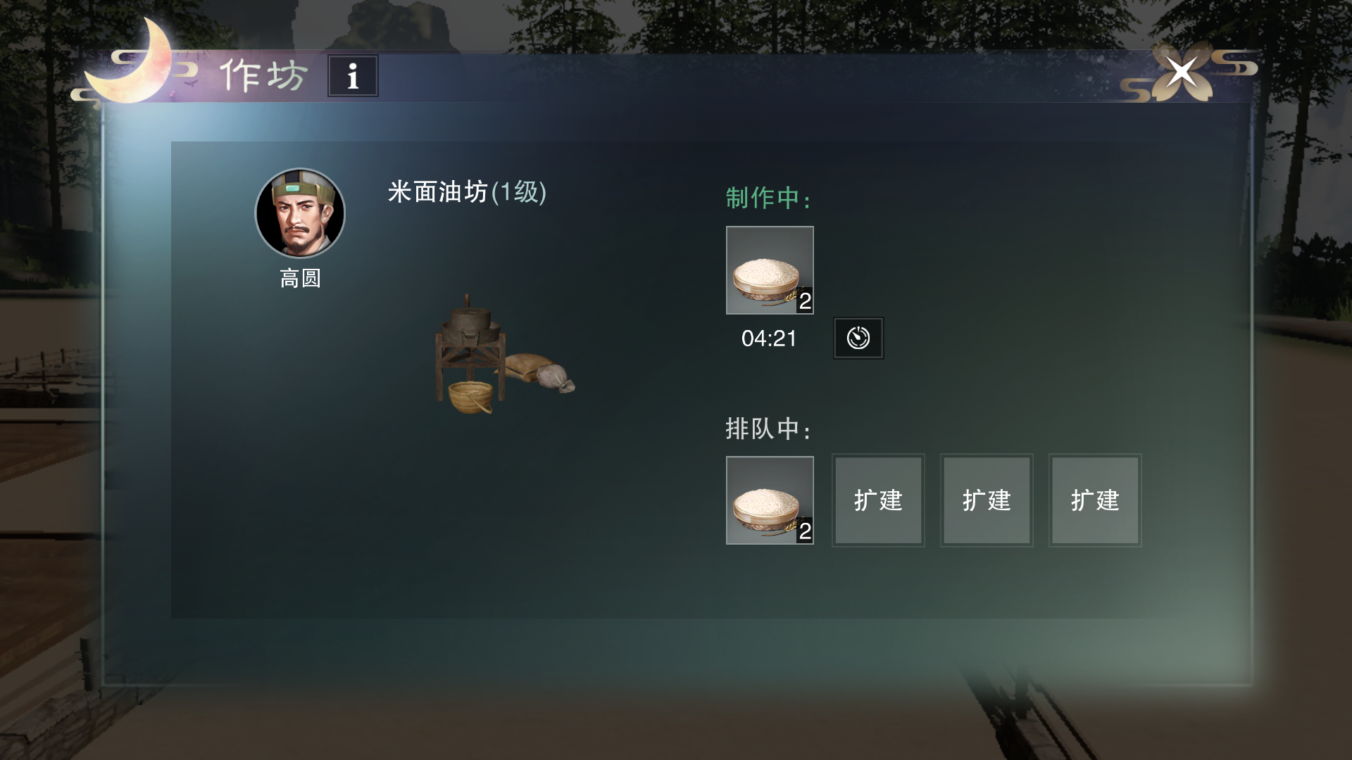 第二步:放置东西后先看广告牌,然后就是去府邸商城买高粱和羊,价格很便宜,随便买多少。这两种作物都好像是十分钟左右成熟,高粱可以收获120个,羊肉一次55个。米面油作坊主要是加工大麦,需要派遣一个专门的npc制作,这里说一下这个加工的一个技巧。加工需要时间,可以选择用银两一键加速,这个计算价钱的时间节点是15秒,也就是说小于15秒的时候加速可以不需要银两。
