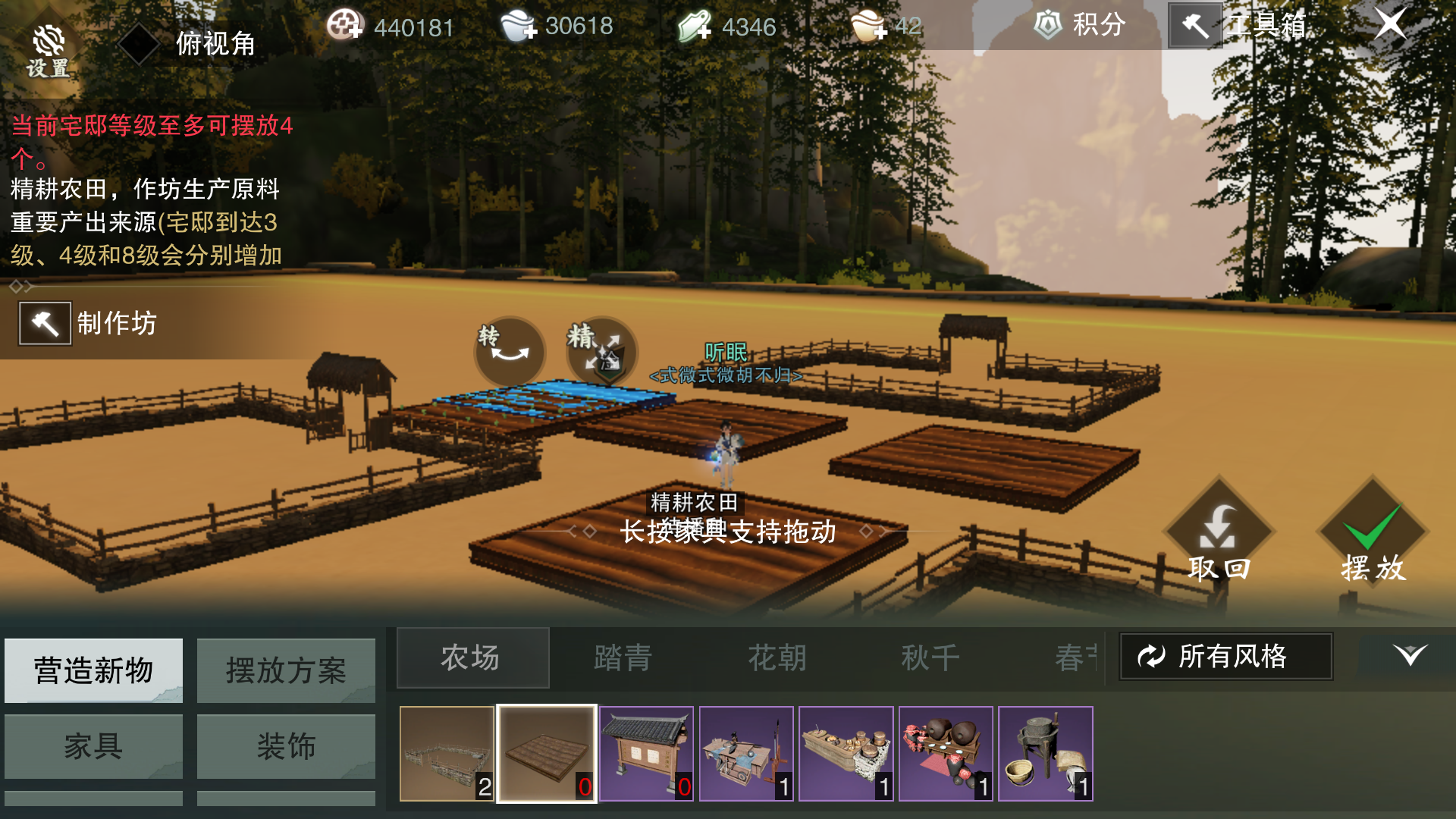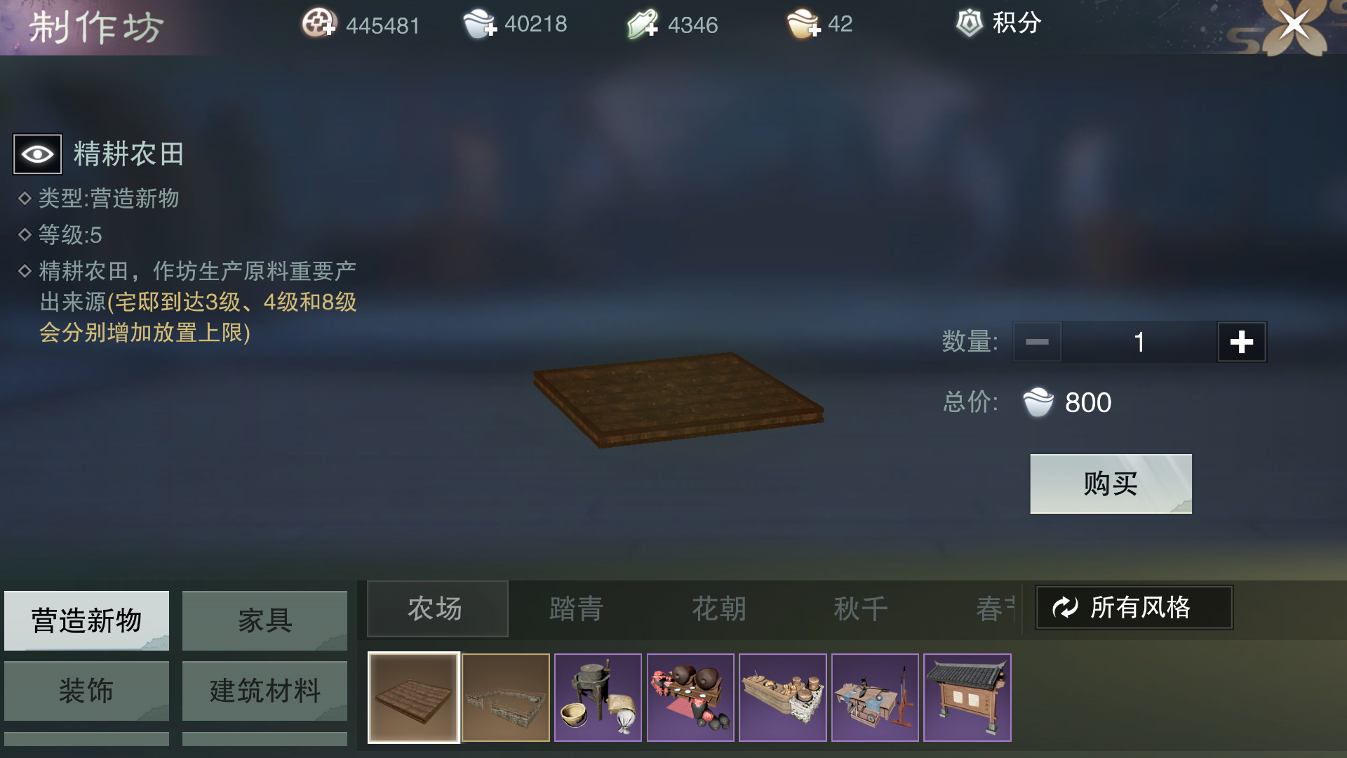 第一步:购买准备,需要去制作坊的农场那一栏买田和栅栏,这个有放置上限,分别是依据府邸等级(2.4.8,眠眠府邸四级可以放4块田两个栅栏)。然后买广告牌和米面油的作坊,后面的酒厂之类的要等农场升级才有用,前期可以不买。