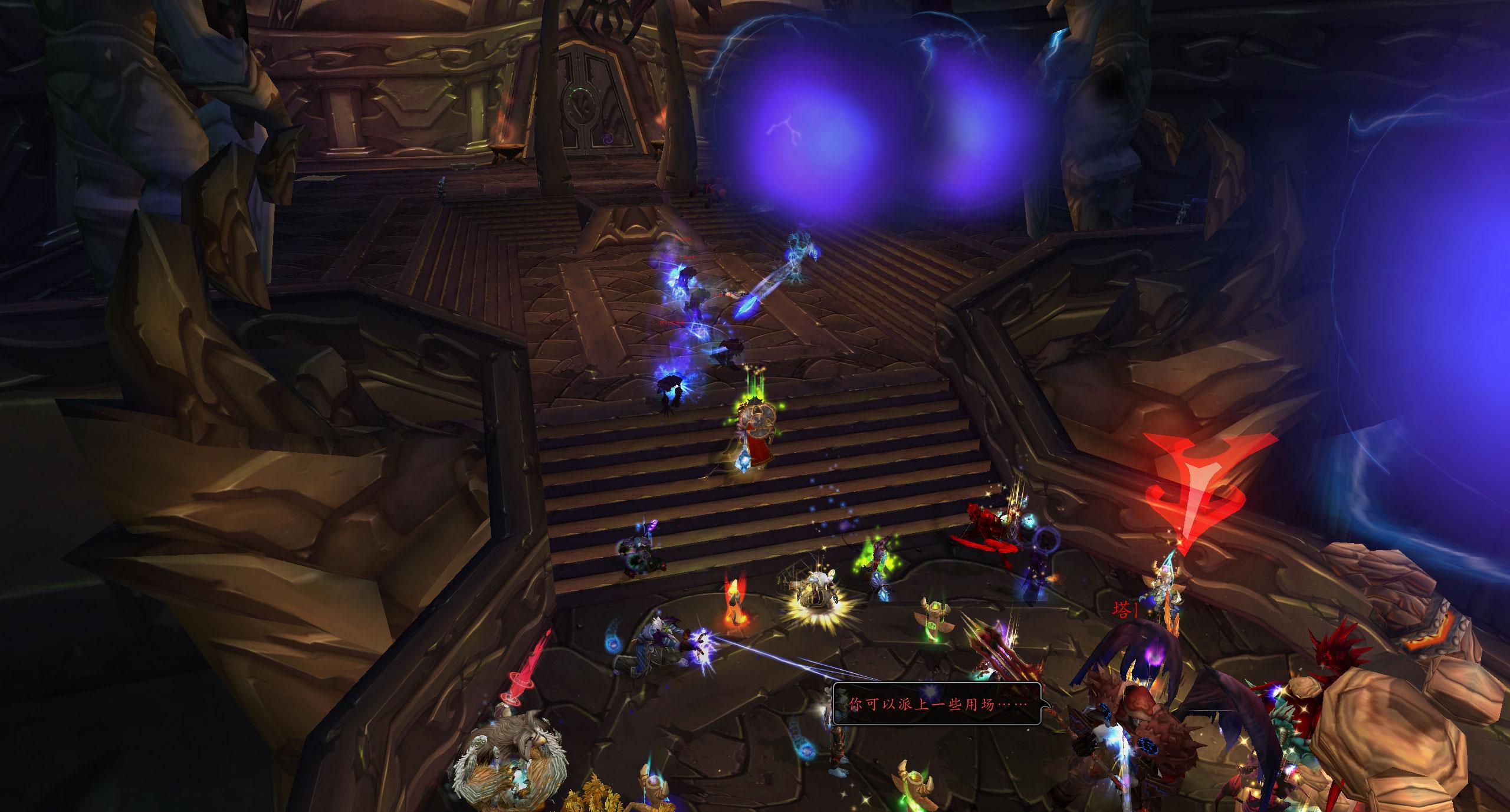 如上图所示把塔隆血魔来到两个门之间,塔隆血魔在内门处,而玩家则站在外门之处。一进战斗内门会关闭,外门则是打开的,这样玩家中了死亡之影技能以后就可以往回跑,玩家变成复仇之灵后有足够的距离击杀小怪,哪怕玩家不了解技能也有足够的时间查看技能,完全可以击杀小怪,而不影响到大团。